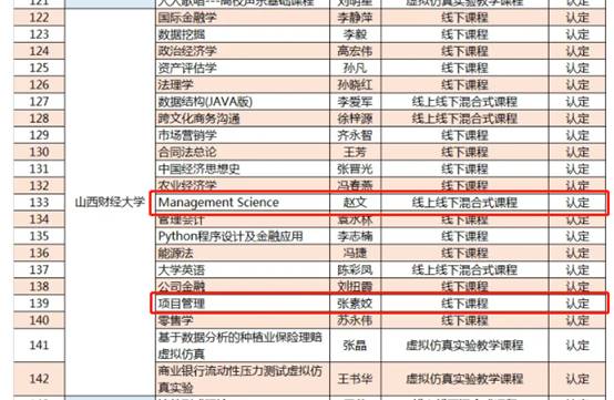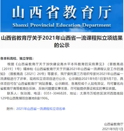 2021年9月1日,山西省教育厅对2021年山西省一流课程拟立项结果进行了公示。69av 赵文副教授负责的《Management Science》、张素姣副教授负责的《项目管理》获得2021年山西省一流课程认定公示,阎俊爱教授负责的《工程计量与计价》获得2021年山西省一流课程建设公示。自此,69av 省级一流课程已达到5门。
