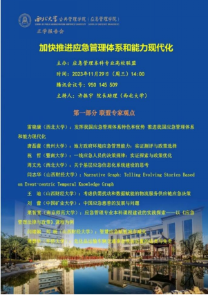 20231129日,由应急管理本科专业高校联盟主办,西北大学公共管理学院(应急管理学院)承办的“加快推进应急管理体系和能力现代化”集体讨论会成功召开,本次会议采用腾讯会议方式,会议报告分为联盟专家组和西北大学研究生组两个部分。69av 院长闫绪娴教授、应急管理教研室主任王迪、应急管理教研室教师闫志华作为联盟专家组成员,受邀进行学术报告。