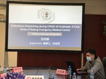 北京交通大学的范伟康博士生首先向与会专家学者做了题为“Ambulance Dispatching during COVID-19 Outbreak: A Case Study of Beijing Emergency Centre”的主题报告,从2020年新冠肺炎疫情出发,结合2020年5月份的北京市急救中心相关数据,将急救车辆和车队结合构建最优算法如何进行急救车最优调度,针对六种情况,生成急救算法,并通过案例分析实现急救车辆的优化调度,达到总救援时间的最小化。与会专家学者就报告中的沟通模型建模以及涉及的影响因素、案例主要侧重关于城区研究的原因、急救车辆分派中的随机优化和调整、病人提出需求的时间先后顺序和病人异质性引起的危重性差异如何结合进行急救车辆的分派等问题和范伟康博士进行了细致探讨。